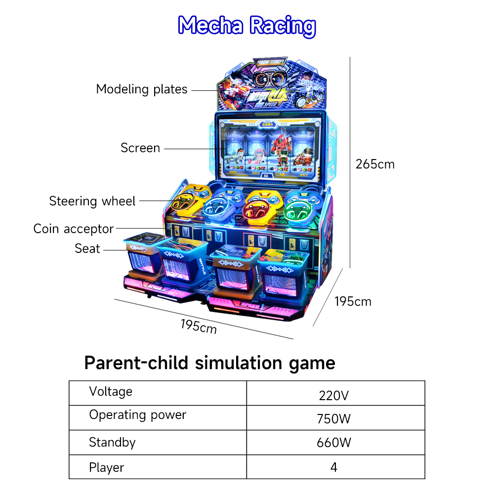 Advantage 1. Precise market positioning A four person fun mode designed specifically for parent-child families, perfectly meeting the entertainment needs of "two child families" Innovative combination of mecha theme and racing elements to create differentiated competitive advantages 2. Energy saving and efficient operation Optimized power configuration achieves low-energy operation, significantly reducing operating costs Accurate standby power control improves equipment efficiency 3. Immersive experience design 65 inch large screen with 4 themed scenes, providing a rich visual experience The parent-child simulation gameplay is simple and easy to learn, suitable for children of all ages to participate in 4. Space utilization advantages Reasonable product size design to improve site utilization efficiency Optimized packaging solution facilitates transportation and warehouse management